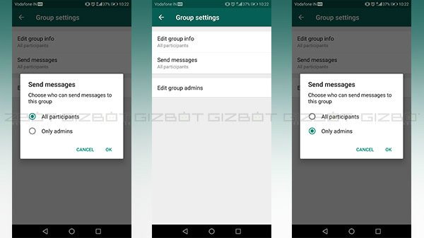 ഈ സവിശേഷത 'Send Messages' എന്ന പേരിലാണ് പുറത്തു വന്നിരിക്കുന്നത്. ഗ്രൂപ്പുകള് വഴി ഒരു വണ് വേ ആശയവിനിമം സാധ്യമാക്കുന്ന പുതിയ ഫീച്ചര് ആണിത്. ഇത് ഗ്രൂപ്പ് ഇന്ഫോര്മേഷനി്ല്, ഗ്രൂപ്പ് സെറ്റിംഗ്സിന്റെ കീഴില് കാണാം. ഈ ഉപ-മെനുവിന്റെ കീഴിലായി നിങ്ങള്ക്ക് രണ്ട് ഓപ്ഷനുകള് കാണാം, ഒന്ന് 'എഡിറ്റ് ഗ്രൂപ്പ് ഇന്ഫോ, രണ്ടാമത്തേത് 'സെന്ഡ് മെസേജസ്' എന്നിങ്ങനെ.