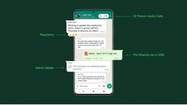 ഗ്രൂപ്പുകളിൽ വരുന്ന മെസേജുകൾക്ക് റിയാക്ഷൻ നൽകാൻ കഴിയുന്ന ഫീച്ചർ, 2 ജിബി വരെ ഫയലുകൾ ഷെയർ ചെയ്യാനുള്ള സംവിധാനം, ഗ്രൂപ്പ് അഡ്മിൻമാർക്ക് കൂടുതൽ കൺട്രോളുകൾ നൽകുന്ന ഫീച്ചറുകൾ എന്നിവയെല്ലാമാണ് വാട്സ്ആപ്പ് അവതരിപ്പിച്ചിരിക്കുന്നത്. ഇതിൽ ഏറ്റവും ശ്രദ്ധേയം മെസേജുകൾക്ക് റിയാക്ഷൻ നൽകുന്നതിനുള്ള ഫീച്ചർ തന്നെയാണ്. വാട്സ്ആപ്പ് ഗ്രൂപ്പുകളിൽ ഈ ഫീച്ചറുകൾ കമ്പനി ഔദ്യോഗികമായി പ്രഖ്യാപിച്ചിട്ടുണ്ട്. എന്നാൽ ഇത് എല്ലാ ഉപയോക്താക്കൾക്കും ലഭ്യമാക്കാൻ സമയമെടുക്കും.