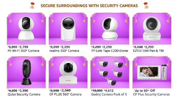 ആമസോൺ ഗ്രേറ്റ് ഇന്ത്യൻ ഫെസ്റ്റിവൽ സെയിലിലൂടെ എംഐ 360° ഹോം സെക്യൂരിറ്റി ക്യാമറ നിങ്ങൾക്ക് 30 ശതമാനം കിഴിവിൽ സ്വന്തമാക്കാൻ സാധിക്കും. എംഐ 360° ഹോം സെക്യൂരിറ്റി ക്യാമറ 2കെ പ്രോയും 27 ശതമാനം കിഴിവോടെ ലഭ്യമാണ്. റിയൽമി 360 ഡിഗ്രി 1080p ഫുൾ എച്ച്ഡി വൈഫൈ സ്മാർട്ട് സെക്യൂരിറ്റി ക്യാമറയും കുറഞ്ഞ വിലയ്ക്ക് ലഭ്യമാണ്. ആമസോൺ ഗ്രേറ്റ് ഇന്ത്യൻ ഫെസ്റ്റിവൽ സെയിലിലൂടെ 30 ശതമാനം കിഴിവിൽ ടിപി ലിങ്ക് ടാപോ വൈഫൈ പാൻ/ടിൽറ്റ് സ്മാർട്ട് സെക്യൂരിറ്റി ക്യാമറ സ്വന്തമാക്കാം. ആമസോൺ ഗ്രേറ്റ് ഇന്ത്യൻ ഫെസ്റ്റിവൽ സെയിലിലൂടെ 67 ശതമാനം വരെ കിഴിവുകളിൽ 360 ഡിഗ്രി പോർട്ടബിൾ സെക്യൂരിറ്റി ക്യാമറകൾ ലഭ്യമാണ്. ഈ സെയിലിലൂടെ വിലക്കിഴിവിൽ വാങ്ങാവുന്ന ക്യാമറകൾ നോക്കാം.