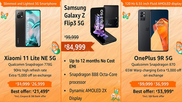 ടെക്നോയുടെ ഏറ്റവും പുതിയ ബജറ്റ് സ്മാർട്ട്ഫോണായ ടെക്നോ പോപ് 5എൽടിഇ ഇപ്പോൾ 30 ശതമാനം വിലക്കിഴിവിൽ ലഭ്യമാണ്. ഷവോമി 11 ലൈറ്റ് എൻഇ, വൺപ്ലസ് 9 5ജി പോലുള്ള ജനപ്രിയ ഡിവൈസുകൾക്കും ആമസോൺ വിലക്കിഴിവ് നൽകുന്നുണ്ട്. ഈ സെയിലിലൂടെ ഏറ്റവും മികച്ച ഓഫറുകളിൽ സ്വന്തമാക്കാവുന്ന സ്മാർട്ട്ഫോണുകളും അവയ്ക്ക് ലഭിക്കുന്ന ഡീലുകളും നോക്കാം. ഐക്യുഒഒ Z3 5ജി, സാംസങ് ഗാലക്സി എസ്20 എഫ്ഇ 5ജി, വൺപ്ലസ് 9ആർ തുടങ്ങിയ സ്മാർട്ട്ഫോണുകൾക്കും മികച്ച ഓഫറുകൾ ലഭിക്കും.