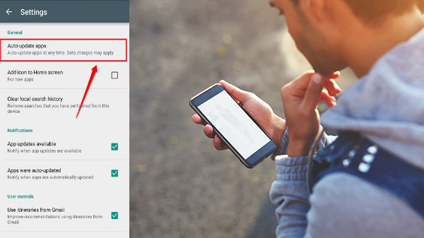 ഒരു ഇന്റര്നെറ്റ് കണക്ഷന് ഉണ്ടെങ്കില് ആന്ഡ്രോയിഡ് ആപ്ലിക്കേഷനുകള് സ്വമേധയ അപ്ഡേറ്റ് ചെയ്യും. ഇത് പ്രക്രിയ വളരെയധികം ഡാറ്റ ഉപയോഗിക്കുന്നു. ഇതു നിങ്ങള്ക്കു തന്നെ നിയന്ത്രിക്കാവുന്നതാണ്. നിങ്ങള് ഒരു വൈഫൈ നെറ്റ്വര്ക്ക് ഉപയോഗിക്കുമ്പോള് മാത്രം അപ്ഡേറ്റ് ചെയ്യാന് അനുവദിക്കുക. അതിനായി ആദ്യം പ്ലേ സ്റ്റോര്> സെറ്റിംഗ്സ്, ജനറല്, ഓട്ടോ അപ്ഡേറ്റ് ആപ്സ്> ഓട്ടോ അപ്ഡേറ്റ്സ് ആപ്പ് ഓവര് വൈഫൈ ഒളളി എന്നു ചെയ്യുക.