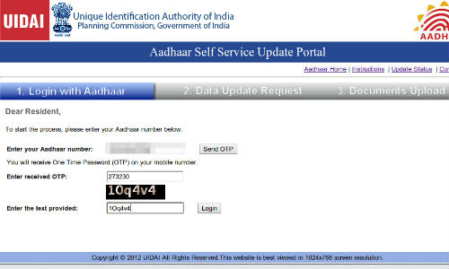 ആദ്യം ആധാര് സെല്ഫ് സര്വീസ് പോര്ട്ടലായ https://ssup.uidai.gov.in/web/guest/update -ല് ക്ലിക് ചെയ്യുക. അതില് മുകളില് കാണുന്ന ബോക്സില് ആധാര് നമ്പര് രേഖപ്പെടുത്തുക. ഇനി നടുവില് കാണുന്ന കോഡ് അതിനു തൊട്ടു താഴെയുള്ള ബോക്സില് അതുപോലെ രേഖപ്പെടുത്തുക. തുടര്ന്ന് അധാര് നമ്പര് എഴുതിയതിനു നേരെയായി കാണുന്ന സെന്ഡ് ഒ.ടി.പി. (SEND OTP) ക്ലിക് ചെയ്യുക.
