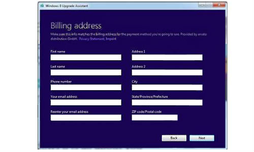 അടുത്ത ജാലകത്തില് വിന്ഡോസ് 8 വാങ്ങാനുള്ള ബില്ലിംഗ് അഡ്രസ്സ് നല്കണം. അതില് പേര്, വിലാസം, ഇമെയില് തുടങ്ങി കുറച്ച് കാര്യങ്ങള് ചേര്ക്കാനുണ്ട്. അതിന് ശേഷം നെക്സ്റ്റ് ക്ലിക്ക് ചെയ്യുക.