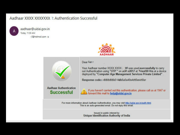 രസീത് ലഭിച്ചതിനു ശേഷം UDAI നിങ്ങള്ക്ക് ഈ കാണുന്നതു പോലെ ഒരു മെയില് അയക്കുന്നതാണ്. അതില് 'Authentication Successful' എന്നും കാണാം.