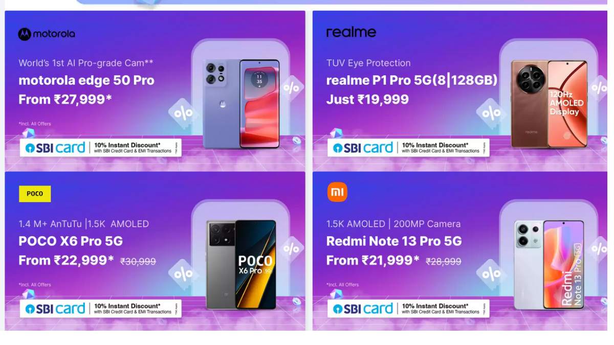 ഗൂഗിൾ പിക്സൽ സ്മാർട്ട്ഫോണുകൾ: പിക്സൽ 8- 49,999 രൂപ, പിക്സൽ 7a - 31,999 രൂപ. ഓപ്പോ സ്മാർട്ട്ഫോണുകൾ: ഓപ്പോ F25 പ്രോ 5G- 21,999 രൂപ, ഓപ്പോ F23 5G- 17,999 രൂപ, ഓപ്പോ റെനോ 10 Pro+ 5G- 50,999 രൂപ.