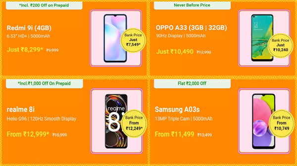 ബജറ്റ് സ്മാർട്ട്ഫോണുകൾ വാങ്ങുമ്പോൾ ഫ്ലിപ്പ്കാർട്ട് നൽകുന്ന ഡിസ്കൌണ്ട് കൂടാതെ ഐസിഐസിഐ ബാങ്ക് കാർഡ് ഉപയോക്താക്കൾക്ക് 10 ശതമാനം ഇൻസ്റ്റന്റ് ഡിസ്കൌണ്ടും ലഭിക്കും. സാംസങ്, ഷവോമി, ഇൻഫിനിക്സ്, ഓപ്പോ, പോക്കോ, റിയൽമി തുടങ്ങിയ ബ്രാന്റുകളുടെ ബജറ്റ് സ്മാർട്ട്ഫോണുകളെല്ലാം ഈ സെയിലിലൂടെ ഓഫറുകളിൽ സ്വന്തമാക്കാം. ഫ്ലിപ്പ്കാർട്ട് ബിഗ് സേവിങ് ഡേ സെയിലിലൂടെ ആകർഷകമായ ഓഫറുകളിൽ സ്വന്തമാക്കാവുന്ന ബജറ്റ് സ്മാർട്ട്ഫോണുകളും അവയ്ക്ക് ലഭിക്കുന്ന ഓഫറുകളും നോക്കാം.