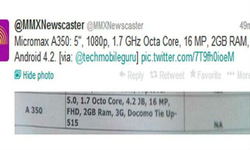 ആഗോളതലത്തില് തന്നെ സാന്നിധ്യമറിയിച്ച ഇന്ത്യന് സ്മാര്ട്ഫോണ് നിര്മാതാക്കളായ മൈക്രോമാക്സ് ഒക്റ്റ കോര് പ്രൊസസര് സ്മാര്ട്ഫോണുമായി എത്തുന്നു. കഴിഞ്ഞ ദിവസം ചില വെബ്സൈറ്റുകളില് പ്രത്യക്ഷപ്പെട്ട A350 ആണ് ഒക്റ്റ കോര് പ്രൊസസര് ആണെന്ന് MMXNewscaster ട്വീറ്റിലൂടെ അറിയിച്ചിരിക്കുന്നത്. ജനുവരി 15-നുള്ളില് ഫോണ് ലോഞ്ച് ചെയ്യുമെന്നും പറയുന്നു.