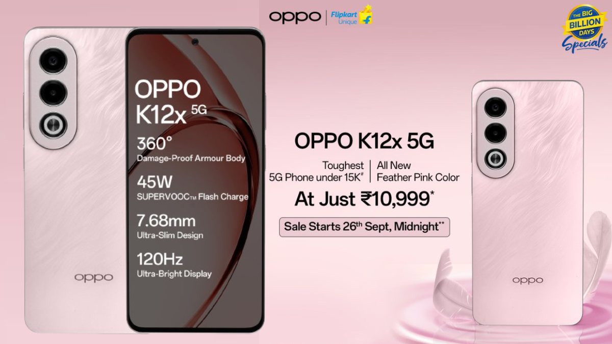 സ്മാർട്ട്ഫോൺ വിൽപ്പനയുടെ പൂരമായ ഫ്ലിപ്പ്കാർട്ട് ബിഗ് ബില്യൺ ഡേയ്സിൽ അണിനിരക്കാൻ ഓപ്പോയുടെ ബജറ്റ് 5ജി സ്മാർട്ട്ഫോണായ ഓപ്പോ K12x 5ജി (OPPO K12x 5G) പുതിയ കളർ വേരിയന്റിൽ ലോഞ്ച് ചെയ്തു. മിലിട്ടറി-ഗ്രേഡ് ഡ്യൂറബിലിറ്റി വാഗ്ദാനം ചെയ്യുന്ന ഈ ബജറ്റ് 5ജി സ്മാർട്ട്ഫോൺ മുൻപ് ബ്രീസ് ബ്ലൂ, മിഡ്നൈറ്റ് വയലറ്റ് നിറങ്ങളിലാണ് ലോഞ്ച് ചെയ്തത്. എന്നാലിപ്പോൾ ഫ്ലിപ്പ്കാർട്ട് ഓഫർ സെയിലിനോട് അനുബന്ധിച്ച് ആകർഷകമായ പുതിയ ഫെതർ പിങ്ക് കളർ വേരിയന്റിൽ ഓപ്പോ കെ12x 5ജി ഇന്ത്യയിൽ അവതരിപ്പിച്ചിരിക്കുന്നു.