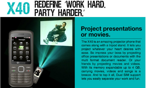 240x360 പിക്സല് റെസലൂഷനിലുള്ള 2.36 ഇഞ്ച് ടിഎഫ്ടി ഡിസ്പ്ലെയാണ് ഈ ഡ്യുവല് സിം ഫോണിനുള്ളത്. 2 മെഗാപിക്സലാണ് ക്യാമറ. 80 എംബി ഇന്റേണല് മെമ്മറിയാണ് എക്സ്40യ്ക്കുള്ളത്. അതു കൂടാതെ 8 ജിബി വരെ മൈക്രോഎസ്ഡി കാര്ഡ് മെമ്മറി പിന്തുണയും ഉണ്ട്. വില: 4,600 രൂപ