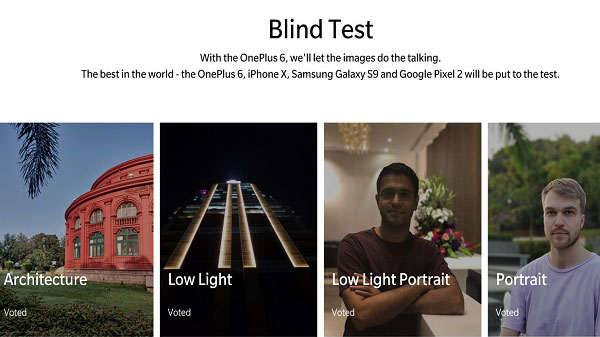 വെബ്സൈറ്റിൽ Architecture, Low-light, Low-light Portrait, Portrait എന്നിങ്ങനെ നാല് വിഭാഗങ്ങൾ കാണാം. ഓരോ വിഭാഗത്തിലും ഈ നാല് ഫോണുകളിലും എടുത്ത ചിത്രങ്ങൾ ഉൾപ്പെടുത്തിയിട്ടുണ്ട്. ഇവയിൽ മികച്ചത് ഏതെന്ന് കണ്ടെത്തി വോട്ട് ചെയ്യുകയാണ് വേണ്ടത്. എന്നാൽ നമ്മൾ കരുതുന്ന പോലെ അത്ര എളുപ്പമായിരുന്നില്ല കാര്യങ്ങൾ. വൺപ്ലസ് 6 എന്നുപറയുമ്പോൾ മറ്റു ഫോണുകളുമായി താരതമ്യം ചെയ്യുമ്പോൾ വില കുറഞ്ഞതാണല്ലോ എന്ന ധാരണയിൽ ക്യാമറയും അത്ര നിലവാരമല്ലേ ഉണ്ടാകൂ എന്നും കരുതി എളുപ്പം കണ്ടുപിടിക്കാമെന്ന് കരുതി കയറി നോക്കിയാൽ അത്ഭുതപ്പെടും. കാരണം വൺപ്ലസ് 6 ക്യാമറ കണ്ടെത്തുവാൻ കഴിയുകയേ ഇല്ല എന്നത് തന്നെ. അത്രക്കും കൃത്യമാണ് ഓരോ ചിത്രങ്ങളും.