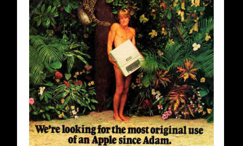 പുരാണത്തില് പറയുന്ന ആദത്തിന്റെ ആപ്പിളുമായി ബന്ധിപ്പിച്ച് നിര്മിച്ച പരസ്യമാണിത്. ഏതു കാലഘട്ടത്തിലായാലും ആപ്പിള് അന്നന്നത്തെ സാങ്കേതിക വിദ്യക്കനുസരിച്ച് വളരുന്നു എന്നതാണ് പരസ്യംകൊണ്ട് അര്ഥമാക്കിയത്. ഇതും വിപണിയില് ആപ്പിളിന് ഏറെ പ്രചാരം നേടിക്കൊടുത്തു.