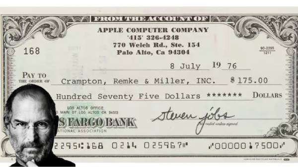 ആപ്പിൾ സ്ഥാപിതമായ 1976 ൽ ഒപ്പിട്ട ചെക്ക് ആണ് എന്നത് ഈ ചെക്കിന്റെ മൂല്യം ഉയർത്തുന്നു. 770 Welch Rd., Ste. 154, Palo Alto എന്നതാണ് ചെക്കിൽ കാണുന്ന അഡ്രസ്. ആപ്പിളിന്റെ ആദ്യത്തെ വിലാസമായിരുന്നു ഇത്. അതിനാൽത്തന്നെ ആപ്പിളിന്റെ ആദ്യ വിലാസമുള്ള ചെക്ക് എന്ന പ്രത്യേകതയും ഈ ചെക്കിന്റെ മൂല്യം ഉയർത്താൻ കാരണമായിട്ടുണ്ട്.