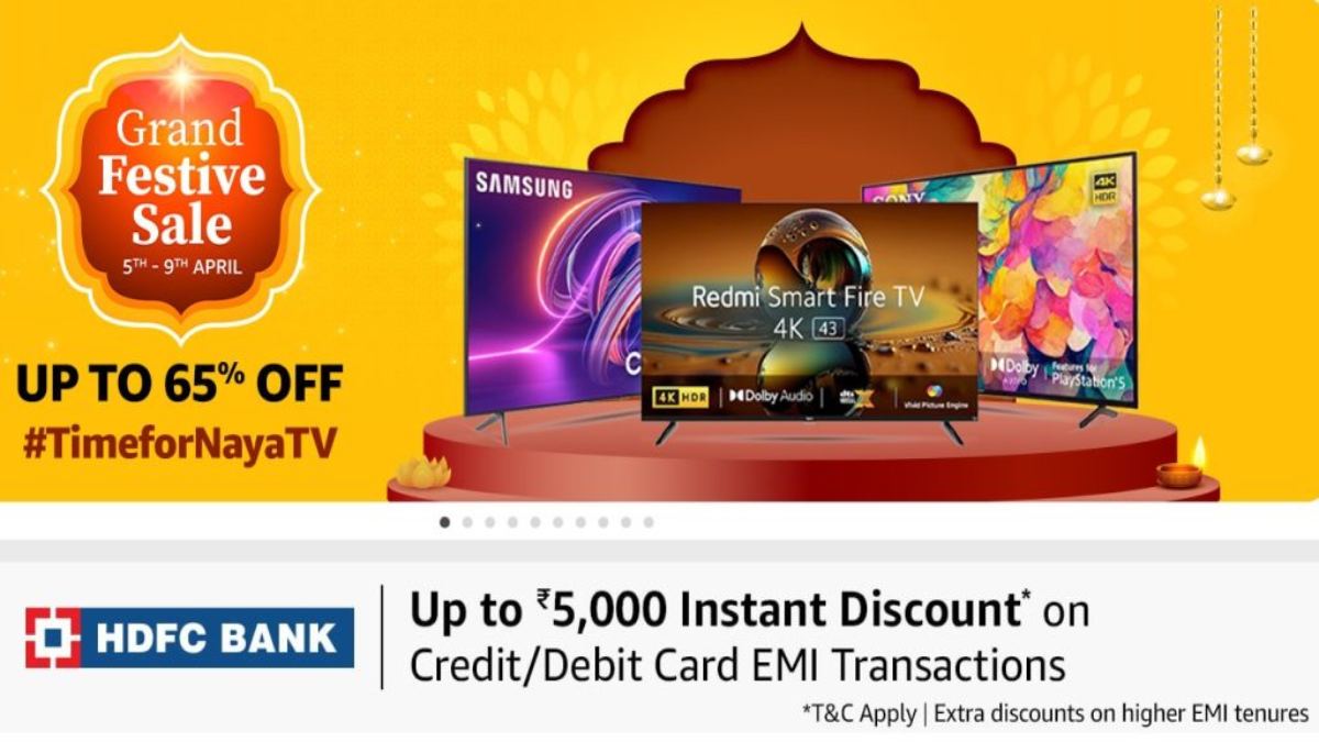 സ്മാർട്ട് ടിവികൾക്ക് വമ്പൻ ഓഫറുകൾ പ്രഖ്യാപിച്ചികൊണ്ട് ആമസോണിൽ ഗ്രാൻഡ് ഫെസ്റ്റിവൽ സെയിൽ ആരംഭിച്ചു. പ്രമുഖ സ്മാർട്ട് ടിവി നിർമ്മാതാക്കളായ സാംസങ്, സോണി, എൽജി, റെഡ്മി, മി, ടിസിഎൽ, എയ്സർ തുടങ്ങിയ കമ്പനികളുടെ ടിവികൾക്ക് എല്ലാം ഈ വിൽപനയിൽ 65 ശതമാനം വരെ ഡിസ്കൗണ്ട് ആണ് വാഗ്ദാനം ചെയ്യുന്നത്.