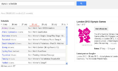 ഇനി ഒളിംപിക്സ്, ലണ്ടന് ഒളിംപിക്സ്, ഒളിംപിക്്സ് ഗെയിം തുടങ്ങി ഒളിംപിക്സുമായി ബന്ധപ്പെട്ട എന്തെങ്കിലും കീവേര്ഡ് നല്കി സെര്ച്ച് ചെയ്താല് സെര്ച്ച് പേജില് ഷെഡ്യൂളും ഒപ്പം ഔദ്യോഗിക വെബ്സൈറ്റ് ലിങ്കും ലഭിക്കും.