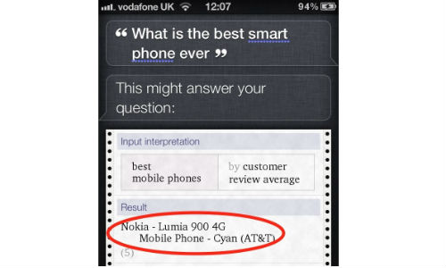 വോല്ഫ്രാം റിസര്ച്ച് എന്ന കമ്പനി വികസിപ്പിച്ചെടുത്ത വോല്ഫ്രാം ആല്ഫ എന്ന ഏന്സര് എഞ്ചിന് ഉത്തരമാണ് സിരി നല്കിയത്. ഉപയോക്താക്കളില് നിന്ന് ലഭിക്കുന്ന അഭിപ്രായമാണ് ഈ ഏന്സര് എഞ്ചിനില് വരിക. നോക്കിയ ഏറെ പ്രതീക്ഷകളോടെ അവതരിപ്പിച്ച വിന്ഡോസ് ഫോണാണ് ലൂമിയ 900. മികച്ച പ്രതികരണമാണ് ഇതിന് ഉപയോക്താക്കളില് നിന്ന് ലഭിക്കുന്നതും.