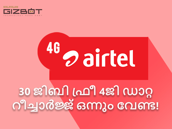 എയര്ടെല് 30ജിബി സൗജന്യ 4ജി ഡാറ്റ നല്കുന്നു! റീച്ചാര്ജ്ജ് ഒന്നും തന്നെ വേണ്ട!