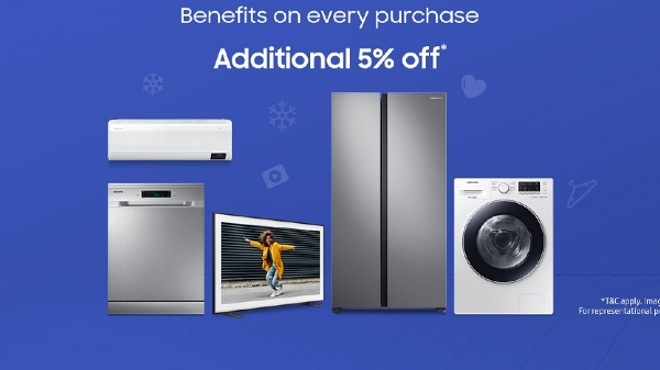 'സാംസങ് ഹോം' പ്രോഗ്രാമിന് കീഴിൽ, ഏതെങ്കിലും സാംസങ് ഗ്യാലക്സി അല്ലെങ്കിൽ കൺസ്യൂമർ ഡ്യൂറബിൾ ഉത്പന്നം വാങ്ങുന്ന ഉപഭോക്താക്കൾക്ക് 5 ശതമാനം കിഴിവ് ( 2,500 രൂപ വരെ ) ആണ് ലഭിക്കുന്നത്. സാംസങിൽ നിന്നും ആദ്യമായി ഉത്പന്നങ്ങൾ വാങ്ങുമ്പോൾ ഈ ഡിസ്കൌണ്ട് ലഭിക്കില്ലെന്ന കാര്യം മനസിലാക്കണം. ഒരിക്കൽ സാംസങ് പ്രോഡക്ട്സ് വാങ്ങിയവർ വീണ്ടും സാംസങ് ഇലക്ട്രോണിക്സ് ഉപകരണങ്ങൾ വാങ്ങുമ്പോഴാണ് ഡിസ്കൌണ്ട് ലഭിക്കുക. തുടർന്നുള്ള പർച്ചേസുകളിൽ എല്ലാം ( സാംസങ് പ്രോഡക്ട്സ് വാങ്ങുമ്പോൾ ) സമാനമായ ഡിസ്കൌണ്ട് ലഭിക്കും. 2022 സെപ്റ്റംബർ 30 വരെയാണ് ഓഫറിന്റെ കാലാവധി. ടെലിവിഷനുകൾ, എയർ കണ്ടീഷണറുകൾ, റഫ്രിജറേറ്ററുകൾ, വാഷിങ് മെഷീൻ, ഡിഷ് വാഷറുകൾ എന്നിവയൊക്കെ വാങ്ങുമ്പോൾ ഈ ഓഫർ ബാധകമാണ്.