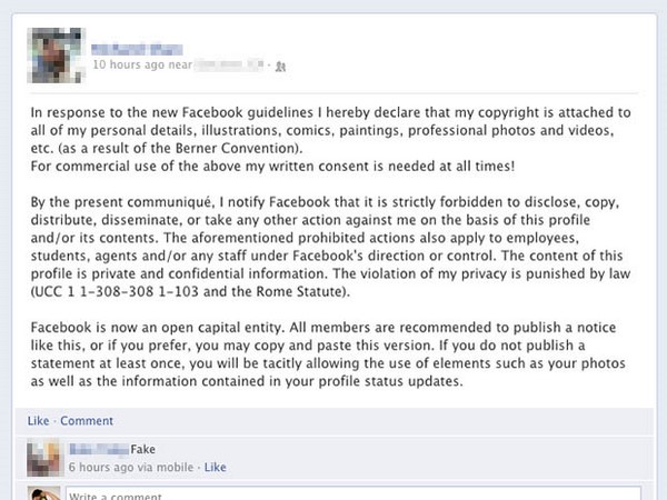 പോസ്റ്റ് പറയുന്നത് ഇപ്രകാരമാണ് - 'In response to the new Facebook guidelines, I hereby declare that my copyright is attached to all of my personal details, illustrations, comics, paintings, professional photos and videos, etc. (as a result of the Berner Convention). For commercial use of the above my written consent is needed at all times!,'