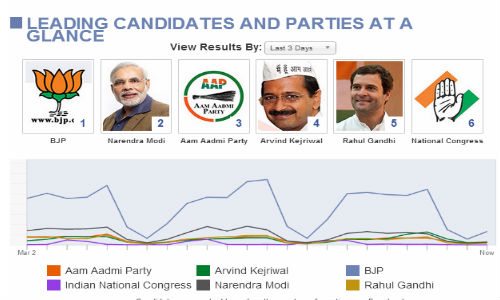 ഫേസ്ബുക്കില് ഏറ്റവും കൂടുതല് പരാമര്ശിച്ച രാഷ്ട്രീയ നേതാക്കളെയും പാര്ട്ടികളെയുമാണ് ആപ്ലിക്കേഷനില് ഹൈലൈറ്റ് ചെയ്ത് കാണിക്കുന്നത്. നിലവില് ബി.ജെ.പി. പ്രധാനമന്ത്രി സ്ഥാനാര്ഥി നരേന്ദ്ര മോഡി, എ.എ.പി നേതാവ് അരവിന്ദ് കെജ്രിവാള്, രാഹുല് ഗാന്ധി എന്നിവരാണ് മുന്നില്. കൂടുതല് അറിയുന്നതിന് ഫേസ്ബുക് ഇലക്ഷന് ട്രാക്കര് ലിങ്കില് ക്ലിക് ചെയ്യുക.