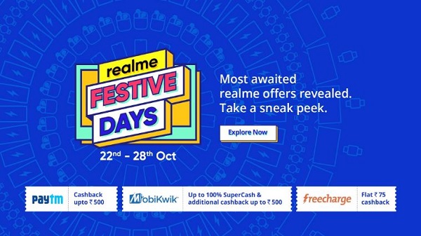 സ്മാർട്ട്ഫോണുകൾ, ഇയർഫോണുകൾ, ടെലിവിഷനുകൾ എന്നിവയുൾപ്പെടെ നിരവധി ഉൽപ്പന്നങ്ങൾക്ക് ആകർഷകമായ വിലക്കിഴിവും ക്യാഷ് ബാക്ക് ഓഫറുകളുമാണ് റിയൽമി ഫെസ്റ്റിവൽ ഡെയ്സ് സെയിലിലൂടെ ലഭിക്കുന്നത്. ഒക്ടോബർ 21ന് അവസാനിക്കേണ്ടിയിരുന്ന ഈ സെയിൽ ഒക്ടോബർ 28 വരെ ലഭ്യമാണ്. ഡിവൈസുകൾ വാങ്ങുമ്പോൾ പേടിഎം, മൊബിക്വിക്ക്, ഫ്രീചാർജ് എന്നിവയിലൂടെ പണം നൽകുന്നവർക്ക് ക്യാഷ്ബാക്കും ലഭിക്കും. ഈ സെയിലിലൂടെ ലഭിക്കുന്ന മികച്ച ഡീലുകൾ പരിശോധിക്കാം.