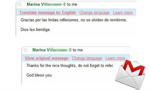 മെയില് സബ്ജക്റ്റിന് വലതുവശത്തായി തിയ്യതി വരുന്ന ഭാഗത്ത് കാണുന്ന ആരോയില് ക്ലിക് ചെയ്താല് ട്രാന്സിലേറ്റ് മേസ്ജ് ഓപഷന് കാണാനാകും. ഏത് ഭാഷയിലേക്ക് വിവര്ത്തനം ചെയ്യേണ്ടതെന്ന് ഭാഷകളുടെ പട്ടികയില് നിന്ന് തെരഞ്ഞെടുക്കാം. ഒട്ടും താമസിയാതെ മെയില് ആ ഭാഷയിലേക്ക് വിവര്ത്തനം ചെയ്യപ്പെട്ടിരിക്കും.