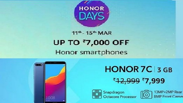 ആമസോൺ ഇന്ത്യയിൽ ഹോണേഴ്സ് ഡേ സെയിൽ ആരംഭിച്ചിരിക്കുന്നു, ഇത് വെള്ളിയാഴ്ച മാർച്ച് 15 വരെ തുടരും. ആമസോൺ വിൽപനയുടെ ഭാഗമായി,ഹോണർ 8X, ഹോണർ 8C, ഹോണർ പ്ലേ, ഹോണർ 7C എന്നിവയ്ക്ക് ഡിസ്കൗണ്ട് വിലകൾ ലഭ്യമാണ്. അഞ്ച് ദിവസത്തെ ആമസോണിന്റെ ഈ വില്പന തിങ്കളാഴ്ച ആരംഭിച്ചു കഴിഞ്ഞു.