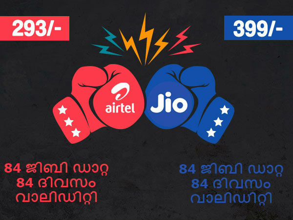 ഏകദേശം ഇതേ ഒരു പ്ലാനാണ് ജിയോയും ഇപ്പോള് അവതരിപ്പിച്ചത്. അതായത് 84ജിബി 4ജി ഡാറ്റ 84 ദിവസത്തെ വാലിഡിറ്റിയില്. എന്നാല് ഈ പ്ലാനിന്റെ വില 399 രൂപയാണ്. എയര്ടെല്ലിനും 399 പ്ലാന് ഉണ്ട്.