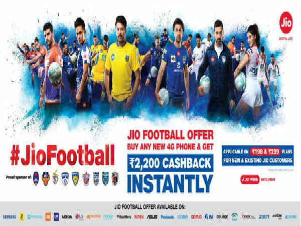 'ജിയോ ഫുഡ്ബോള്' എന്ന പേരിലാണ് പുതിയ സ്മാര്ട്ട്ഫോണുകള് വാങ്ങുന്നവര്ക്ക് 2,200 രൂപ ഇന്സ്റ്റന്റ് ക്യാഷ്ബാക്ക് ഓഫര് ലഭിക്കുന്നത്. ഏത് പുതിയ സ്മാര്ട്ട്ഫോണ് വാങ്ങുന്നവര് ആദ്യം ജിയോ കണക്ഷന് തന്നെ എടുക്കണം എന്നതിനെ ടാര്ഗറ്റ് ചെയ്താണ് ഈ ഓഫര് പ്രഖ്യാപിച്ചിരിക്കുന്നത്.