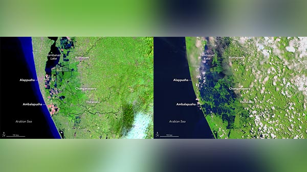 പ്രളയത്തിന് മുമ്പും ശേഷവുമുള്ള കേരളത്തിന്റെ ചിത്രം പുറത്തുവിട്ട് നാസ!