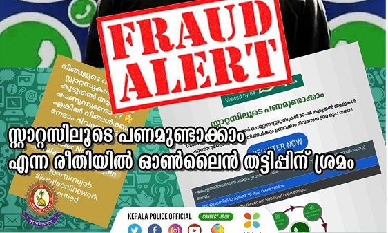 കേരളാ പോലീസിന്റെ ഫേസ്ബുക്ക് പോസ്റ്റിന്റെ പൂർണ രൂപം: ''സ്റ്റാറ്റാസിലൂടെ ദിവസവും 500 രൂപ വരെ സമ്പാദിക്കാൻ അവസരം എന്ന രീതിയിൽ വാട്സ് ആപ്പിലൂടെ ധാരാളം സന്ദേശങ്ങൾ ഷെയർ ചെയ്യുന്നത് ശ്രദ്ധയിൽപ്പെട്ടിട്ടുണ്ട്. സ്റ്റാറ്റസിനൊപ്പം നല്കിയിരിക്കുന്ന ലിങ്കില് ക്ലിക്ക് ചെയ്താല് ഒറ്റ പേജുള്ള ഒരു വെബ്സൈറ്റിലേക്കാണ് പോവുക. അതില് നിങ്ങള് വാട്സ്ആപ്പില് ഷെയര് ചെയ്യുന്ന സ്റ്റാറ്റസുകള് 30 ല് കൂടുതല് ആളുകള് കാണാറുണ്ടോ ? എങ്കില് നിങ്ങള്ക്കും ദിവസേന 500 രൂപ വരെ നേടാം എന്നാണ് നൽകിയിരിക്കുന്നത്. പ്രമുഖ ബ്രാന്ഡുകളുടെ പരസ്യങ്ങള് വാട്സ്ആപ്പില് സ്റ്റാറ്റസായി പോസ്റ്റ് ചെയ്താൽ , ഒരു സ്റ്റാറ്റസിന് 10 മുതല് 30 രൂപവരെ ലഭിക്കുമെന്നും വാട്സ്ആപ്പിലൂടെ മാത്രം 500 രൂപ നേടാമെന്നുമാണ് വെബ്സൈറ്റില് അറിയിച്ചിരിക്കുന്നത്. ഇതിൽ രജിസ്റ്റര് ചെയ്യുന്നവരുടെ വിവരങ്ങൾ ആവശ്യപ്പെടുകയും തുടർന്ന് ബാങ്കിങ് വിവരങ്ങൾ ശേഖരിച്ചു ബാങ്കിംഗ് തട്ടിപ്പുകൾക്കായി ഉപയോഗിക്കാനുമാണ് സാധ്യത. ഇത്തരം തട്ടിപ്പുകൾക്കെതിരെ ജാഗ്രത പാലിക്കുക.''
