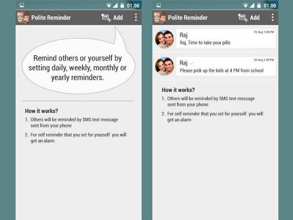 പോളൈറ്റ് റിമൈന്ഡര് എന്ന ആപ് നിങ്ങളെ ഇത്തരത്തിലാണ് സഹായിക്കുന്നത്. നിങ്ങളുടെ ജോലി ആളുകള് കൃത്യസമയത്ത് ചെയ്ത് തീര്ക്കാന് ഈ ആപ് സമയാസമയങ്ങളില് എസ്എംഎസ് സന്ദേശങ്ങള് അയയ്ക്കുകയാണ് ചെയ്യുന്നത്.