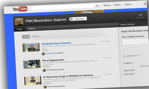 പ്രധാനമന്ത്രി മന്മോഹന്സിംഗിന്റെ ഓഫീസ് യുട്യൂബിലും എത്തി. സോഷ്യല് സൈറ്റുകളിലൂടെ ജനങ്ങളുമായി ആശയവിനിമയം നടത്തുക എന്ന ആശയവുമായി ഇതിന് മുമ്പ് ട്വിറ്ററിലും ഫെയ്സ്ബുക്കിലും പിഎംഒ എത്തിയിരുന്നു.
