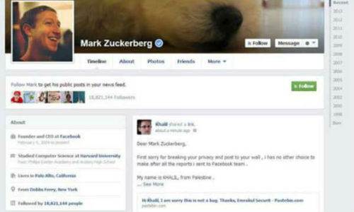 ഫേസ് ബുക്കില് സുരക്ഷാ പാളിച്ചയുണ്ടെന്നു തെളിയിക്കുന്നതിനായി സുരക്ഷാ ഗവേഷകന്, ഫേസ് ബുക്ക് സ്ഥാപകന് മാര്ക്ക് സുക്കര്ബര്ഗിന്റെ വോള് ഹാക്ക് ചെയ്തു. നിരവധി തവണ സുരക്ഷാ പാളിച്ചയെ കുറിച്ച് അറിയിച്ചിട്ടും ഫേസ് ബുക്ക് സുരക്ഷാ വിഭാഗം അത് ഗൗരവമായി എടുക്കാതിരുന്നതാണ് സുക്കര്ബറഗിന്റെ പേജ് ഹാക്ക് ചെയ്യാന് സുരക്ഷാ ഗവേഷകനെ പ്രേരിപ്പിച്ചത്.