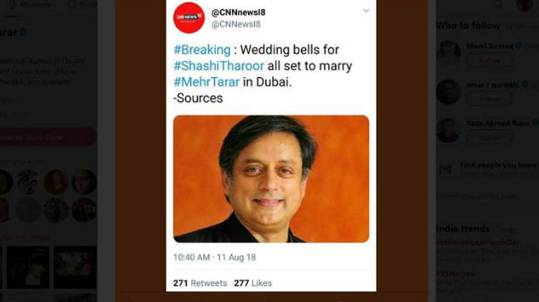 @CNNNewsI8 എന്ന പേരിലുള്ള ഈ അക്കൗണ്ടിൽ നിന്നും "#Breaking : Wedding bells for #ShashiTharoor all set to marry #MehrTarar in Dubai.-Sources" എന്ന ഒരു ട്വീറ്റ് വരികയായിരുന്നു. പെട്ടെന്ന് തെറ്റിദ്ധരിപ്പിക്കപ്പെടുന്ന ഒരു ലോഗോ ആയിരുന്നു ഈ ട്വിറ്റർ അക്കൗണ്ടിന് ഉണ്ടായിരുന്നത്. അതിനാൽ തന്നെ ഇങ്ങനെ ഒരു വാർത്തയും അതിന് CNNNewsI8 എന്ന പേരിലുള്ള അക്കൗണ്ടും കണ്ടതോടെ ആളുകൾ മൊത്തം തെറ്റിദ്ധരിച്ച് ഒറ്റയടിക്ക് വിഷയം സോഷ്യൽ മീഡിയയിൽ വ്യാപിപ്പിക്കുകയായിരുന്നു.