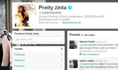 98 ല് ഇറങ്ങിയ മണിരത്നം ചിത്രമായ ദില് സേയില് ഷാരൂഖിന്റെ നായികയായി അരങ്ങേറിയ ഈ നടി ഇന്ത്യന് സിനിമയിലെ പ്രെറ്റി വുമണ് എന്ന പേര് നേടിയ താരമാണ്. സ്ത്രീപക്ഷ ചിന്തകള് നിറയുന്നതാണ് പ്രീതിയുടെ ട്വീറ്റുകളില് അധികവും. സിനിമയില് പ്രഭാവം മങ്ങിയിട്ടും ആരാധകരുടെ കാര്യത്തില് സമ്പന്നയാണ് ഈ നുണക്കുഴിയുള്ള സുന്ദരി. 2,032,358 ഫോളോവേഴസ് ആണ്ഇപ്പോള് പ്രീതിയ്ക്കുള്ളത്.