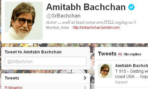 ഇന്ത്യന് സിനിമയുടെ ബിഗ് ബി ആയ അമിതാഭ് ബച്ചനാണ് ട്വിറ്ററില് ഏറ്റവും കൂടുതല് ഫോളോവേഴ്സ് ഉള്ളത്. 3,768,736 പേരാണ് ഇതെഴുതുന്ന സമയത്ത് അദ്ദേഹത്തെ ട്വിറ്ററില് പിന്തുടരുന്നത്. അമിതാഭ് ബച്ചന് ഇത് വരെ അഭിനയിച്ച ചിത്രങ്ങളില് നിന്നുമുള്ള സ്റ്റില്ലുകള് കൊണ്ടുണ്ടാക്കിയ മൊസൈക് ആണ് അദ്ദേഹത്തിന്റെ പ്രൊഫൈല് പശ്ചാത്തലം. വ്യക്തിപരവും, സിനിമാപരവും, ആനുകാലിക പ്രസക്തിയുള്ളവയുമായ പല വിഷയങ്ങളാണ് ബച്ചന്റെ ട്വീറ്റുകളില് നിറയുന്നത്.