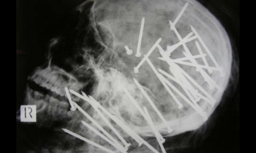 ഉഗ്രശേഷിയുള്ള നെയില് ഗണ് പൊട്ടി ആണികള് തറച്ച ചൈനക്കാരന്റെ തലയോട്ടിയാണ് എക്സ്-റേയില് തെളിയുന്നത്.